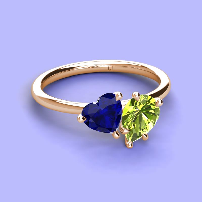 There's something so romantic, and oh-so-enchanting about this duo two stone engagement ring. This spectacular design features Heart Shape Lab Created Blue Sapphire and Pear Shape Peridot that sets at slight angles towards each other.