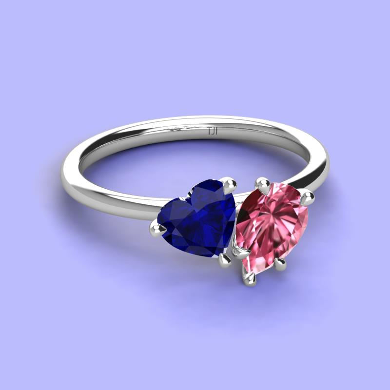 There's something so romantic, and oh-so-enchanting about this duo two stone engagement ring. This spectacular design features Heart Shape Lab Created Blue Sapphire and Pear Shape Pink Tourmaline that sets at slight angles towards each other.