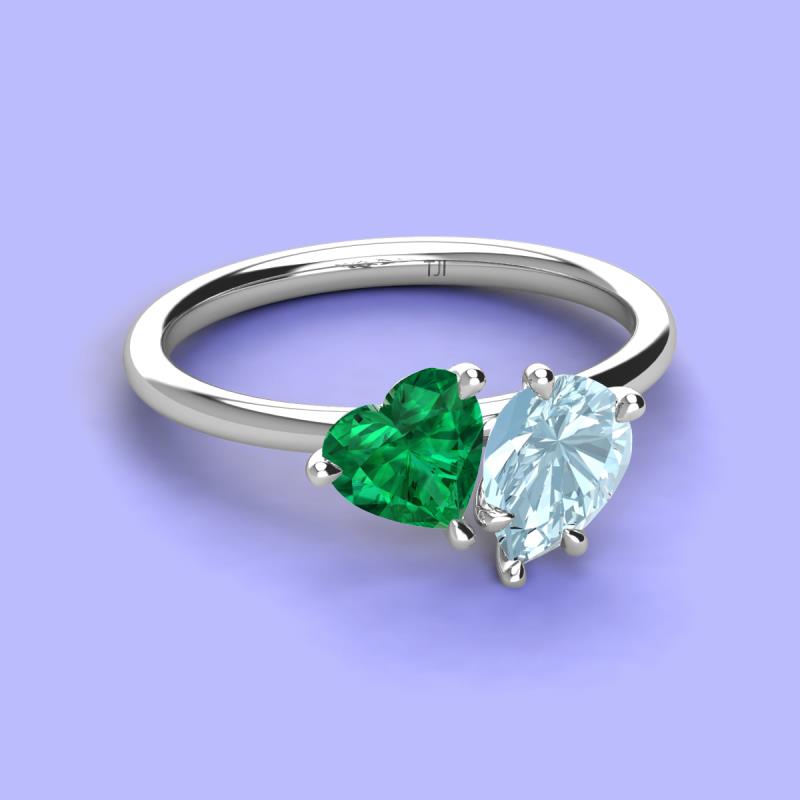 There's something so romantic, and oh-so-enchanting about this duo two stone engagement ring. This spectacular design features Heart Shape Lab Created Emerald and Pear Shape Aquamarine that sets at slight angles towards each other.