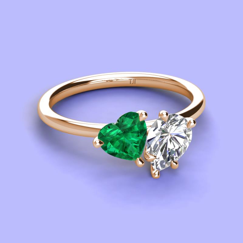 There's something so romantic, and oh-so-enchanting about this duo two stone engagement ring. This spectacular design features Heart Shape Lab Created Emerald and Pear Shape Forever Brilliant Moissanite that sets at slight angles towards each other.