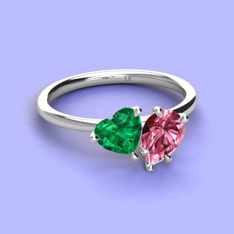 There's something so romantic, and oh-so-enchanting about this duo two stone engagement ring. This spectacular design features Heart Shape Lab Created Emerald and Pear Shape Pink Tourmaline that sets at slight angles towards each other.