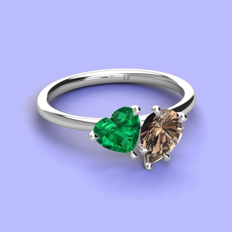 There's something so romantic, and oh-so-enchanting about this duo two stone engagement ring. This spectacular design features Heart Shape Lab Created Emerald and Pear Shape Smoky Quartz that sets at slight angles towards each other.