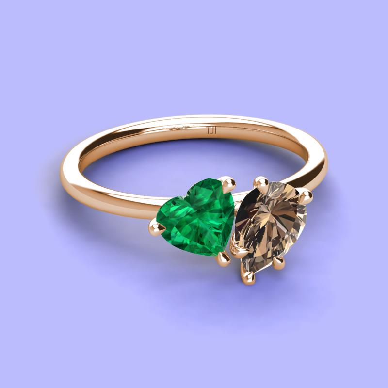 There's something so romantic, and oh-so-enchanting about this duo two stone engagement ring. This spectacular design features Heart Shape Lab Created Emerald and Pear Shape Smoky Quartz that sets at slight angles towards each other.