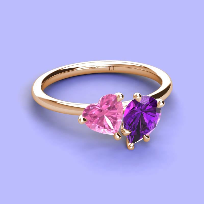 There's something so romantic, and oh-so-enchanting about this duo two stone engagement ring. This spectacular design features Heart Shape Lab Created Pink Sapphire and Pear Shape Amethyst that sets at slight angles towards each other.