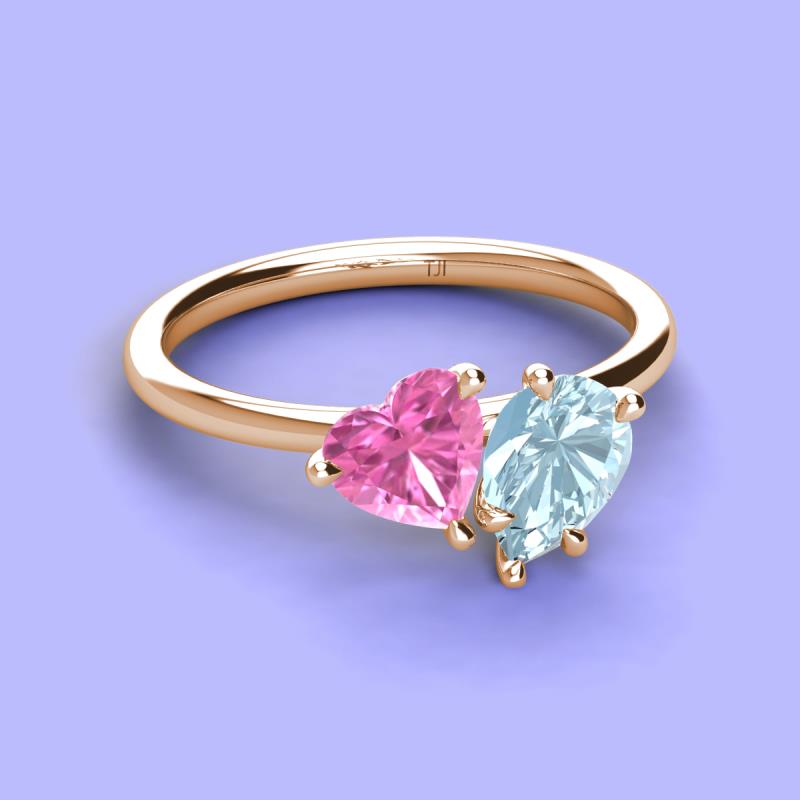 There's something so romantic, and oh-so-enchanting about this duo two stone engagement ring. This spectacular design features Heart Shape Lab Created Pink Sapphire and Pear Shape Aquamarine that sets at slight angles towards each other.