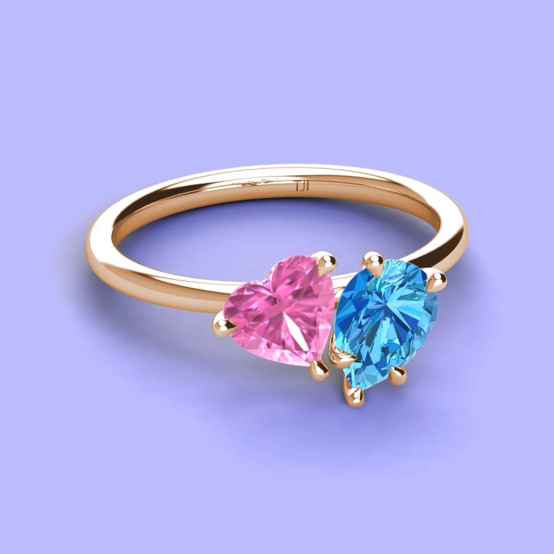 There's something so romantic, and oh-so-enchanting about this duo two stone engagement ring. This spectacular design features Heart Shape Lab Created Pink Sapphire and Pear Shape Blue Topaz that sets at slight angles towards each other.