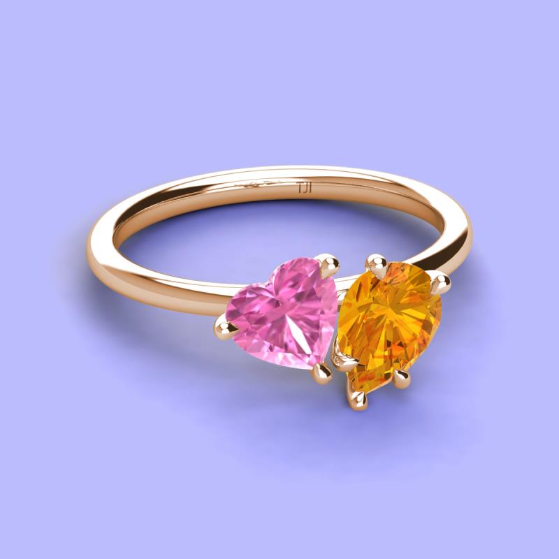 There's something so romantic, and oh-so-enchanting about this duo two stone engagement ring. This spectacular design features Heart Shape Lab Created Pink Sapphire and Pear Shape Citrine that sets at slight angles towards each other.