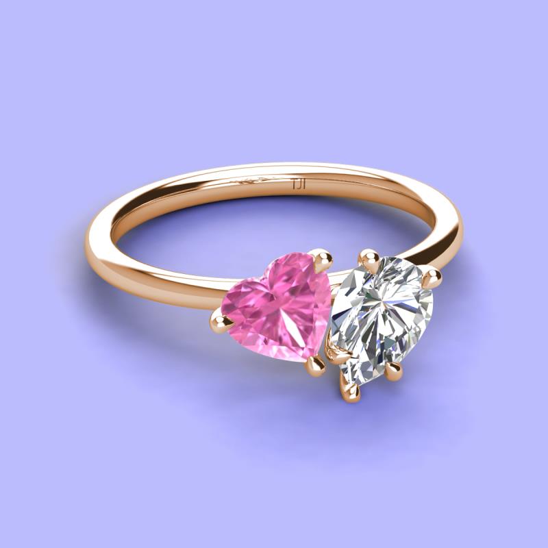 There's something so romantic, and oh-so-enchanting about this duo two stone engagement ring. This spectacular design features Heart Shape Lab Created Pink Sapphire and Pear Shape Forever Brilliant Moissanite that sets at slight angles towards each other.