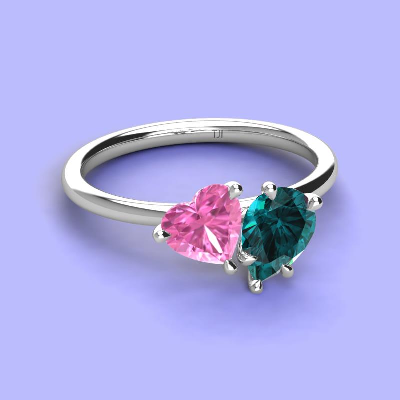 There's something so romantic, and oh-so-enchanting about this duo two stone engagement ring. This spectacular design features Heart Shape Lab Created Pink Sapphire and Pear Shape London Blue Topaz that sets at slight angles towards each other.