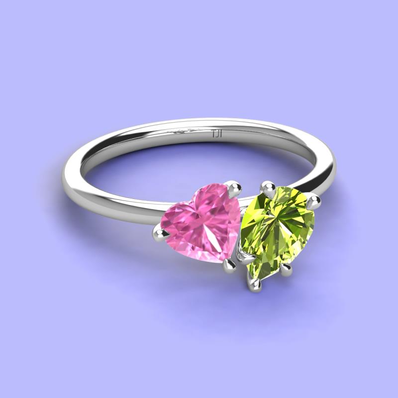 There's something so romantic, and oh-so-enchanting about this duo two stone engagement ring. This spectacular design features Heart Shape Lab Created Pink Sapphire and Pear Shape Peridot that sets at slight angles towards each other.