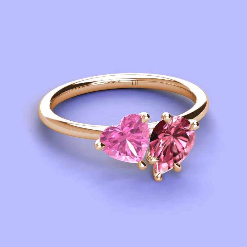 There's something so romantic, and oh-so-enchanting about this duo two stone engagement ring. This spectacular design features Heart Shape Lab Created Pink Sapphire and Pear Shape Pink Tourmaline that sets at slight angles towards each other.