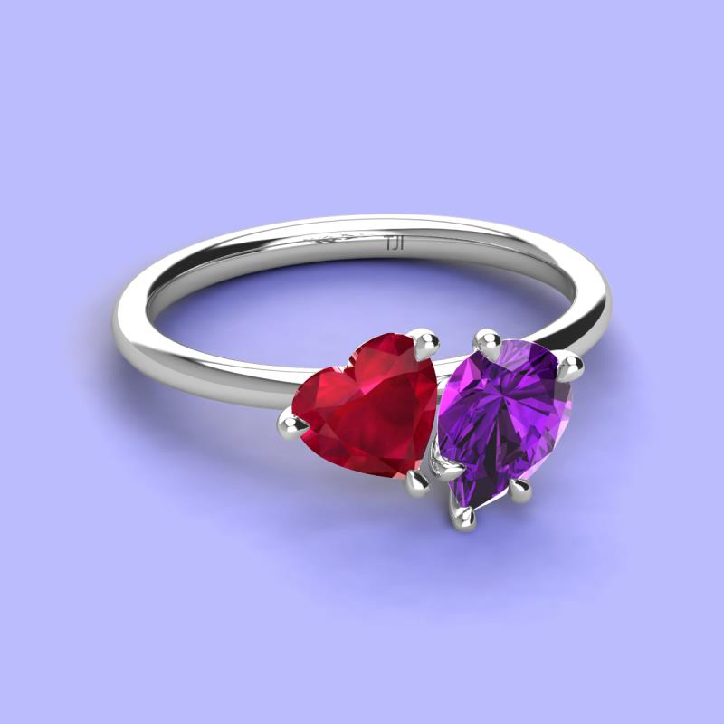 There's something so romantic, and oh-so-enchanting about this duo two stone engagement ring. This spectacular design features Heart Shape Lab Created Ruby and Pear Shape Amethyst that sets at slight angles towards each other.