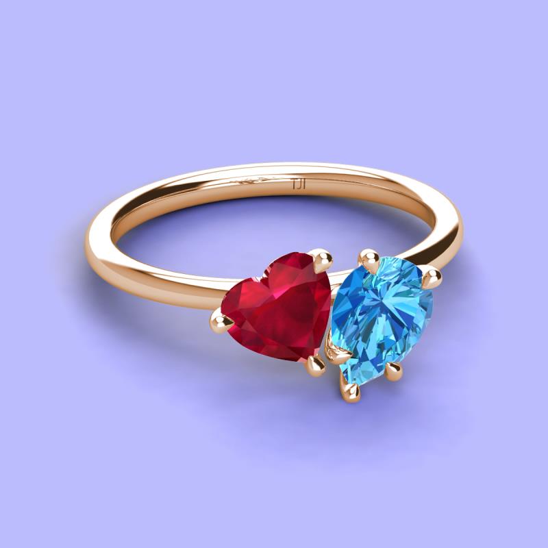 There's something so romantic, and oh-so-enchanting about this duo two stone engagement ring. This spectacular design features Heart Shape Lab Created Ruby and Pear Shape Blue Topaz that sets at slight angles towards each other.