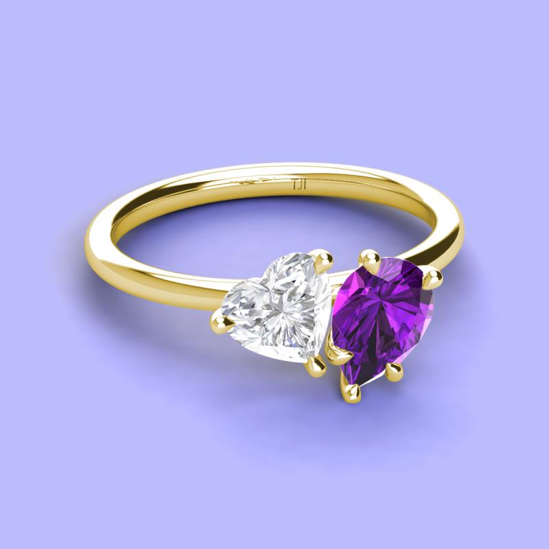 There's something so romantic, and oh-so-enchanting about this duo two stone engagement ring. This spectacular design features Heart Shape Lab Created White Sapphire and Pear Shape Amethyst that sets at slight angles towards each other.
