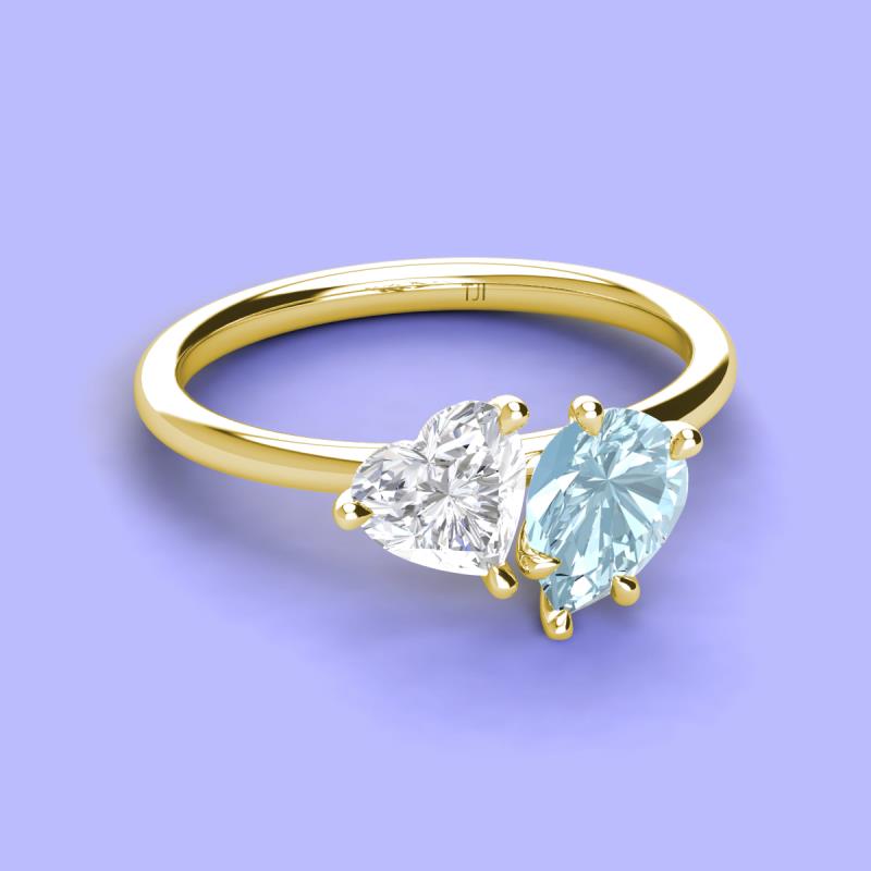 There's something so romantic, and oh-so-enchanting about this duo two stone engagement ring. This spectacular design features Heart Shape Lab Created White Sapphire and Pear Shape Aquamarine that sets at slight angles towards each other.