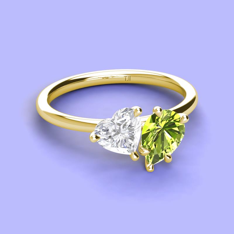 There's something so romantic, and oh-so-enchanting about this duo two stone engagement ring. This spectacular design features Heart Shape Lab Created White Sapphire and Pear Shape Peridot that sets at slight angles towards each other.