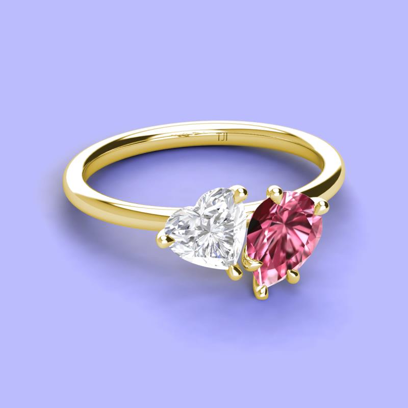 There's something so romantic, and oh-so-enchanting about this duo two stone engagement ring. This spectacular design features Heart Shape Lab Created White Sapphire and Pear Shape Pink Tourmaline that sets at slight angles towards each other.