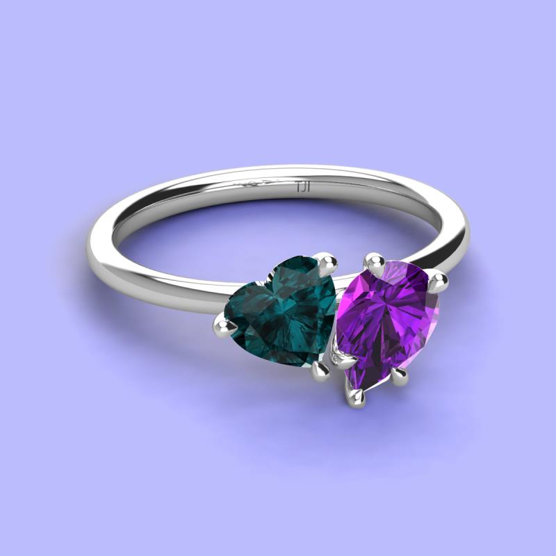 There's something so romantic, and oh-so-enchanting about this duo two stone engagement ring. This spectacular design features Heart shape London Blue Topaz and Pear Shape Amethyst that sets at slight angles towards each other.