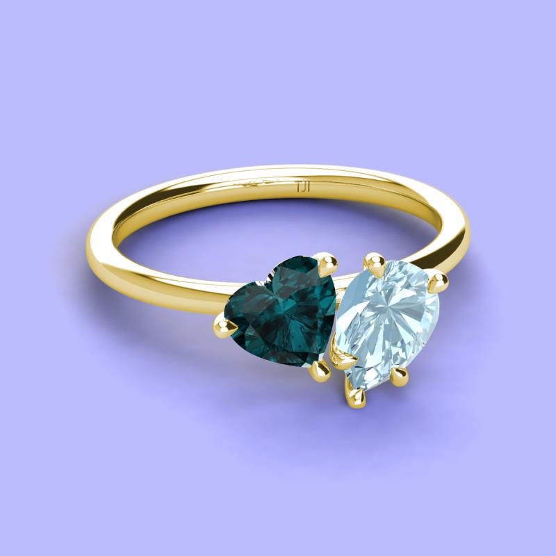 There's something so romantic, and oh-so-enchanting about this duo two stone engagement ring. This spectacular design features Heart shape London Blue Topaz and Pear Shape Aquamarine that sets at slight angles towards each other.