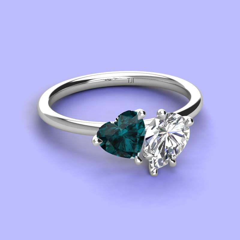 There's something so romantic, and oh-so-enchanting about this duo two stone engagement ring. This spectacular design features Heart shape London Blue Topaz and Pear Shape Forever One Moissanite that sets at slight angles towards each other.
