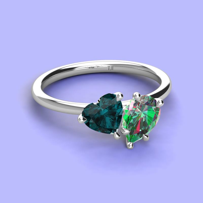 There's something so romantic, and oh-so-enchanting about this duo two stone engagement ring. This spectacular design features Heart shape London Blue Topaz and Pear Shape Lab Created Alexandrite that sets at slight angles towards each other.