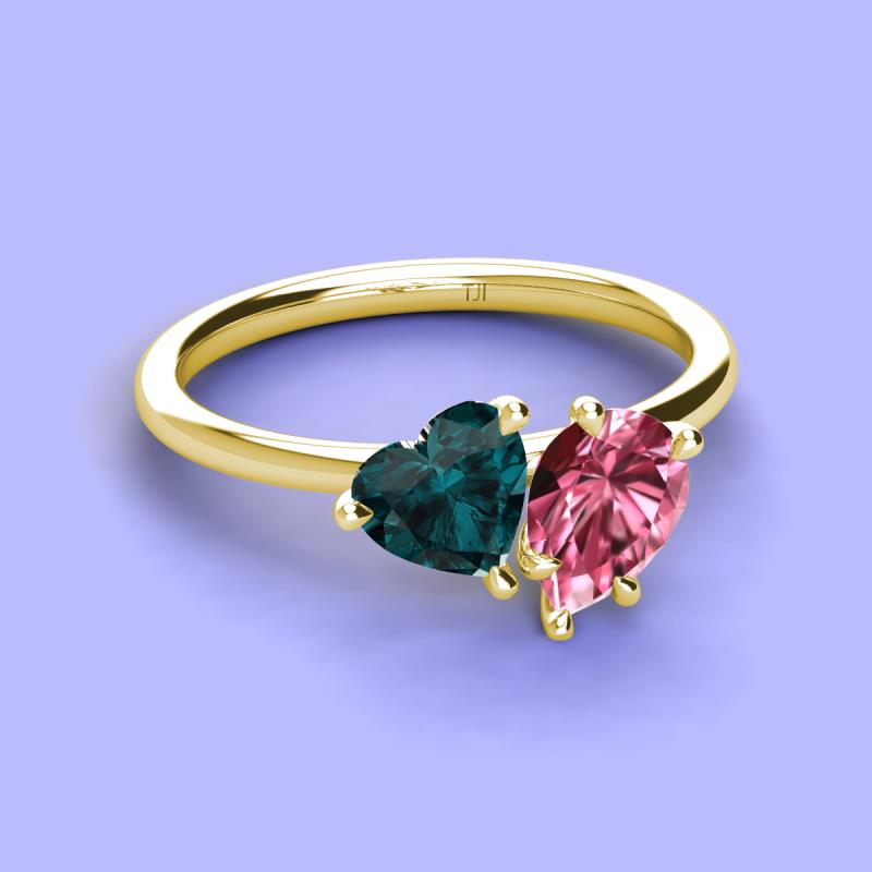 There's something so romantic, and oh-so-enchanting about this duo two stone engagement ring. This spectacular design features Heart shape London Blue Topaz and Pear Shape Pink Tourmaline that sets at slight angles towards each other.