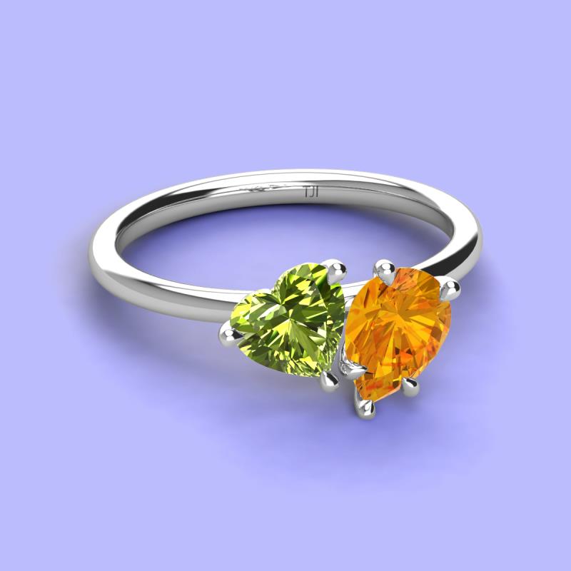 There's something so romantic, and oh-so-enchanting about this duo two stone engagement ring. This spectacular design features Heart shape Peridot and Pear Shape Citrine that sets at slight angles towards each other.