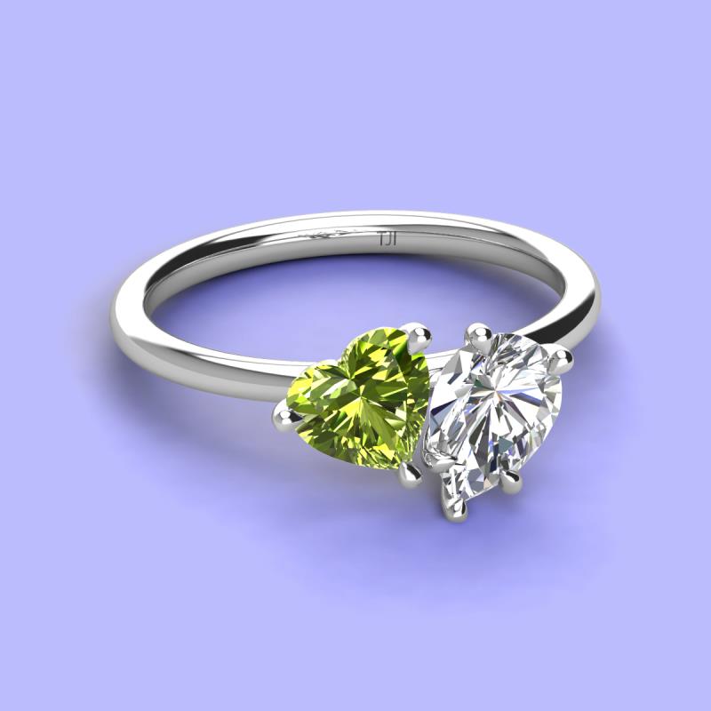 There's something so romantic, and oh-so-enchanting about this duo two stone engagement ring. This spectacular design features Heart shape Peridot and Pear Shape Forever Brilliant Moissanite that sets at slight angles towards each other.