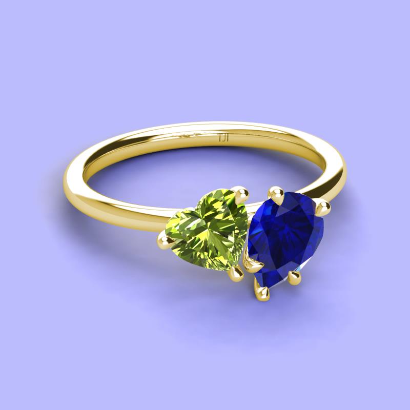 There's something so romantic, and oh-so-enchanting about this duo two stone engagement ring. This spectacular design features Heart shape Peridot and Pear Shape Lab Created Blue Sapphire that sets at slight angles towards each other.