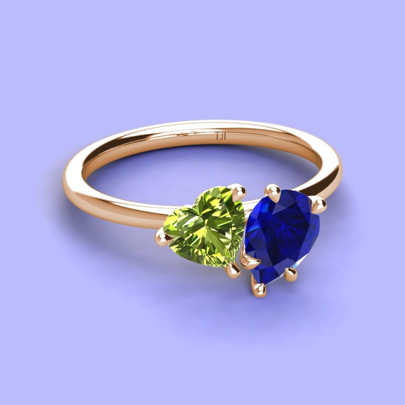 There's something so romantic, and oh-so-enchanting about this duo two stone engagement ring. This spectacular design features Heart shape Peridot and Pear Shape Lab Created Blue Sapphire that sets at slight angles towards each other.