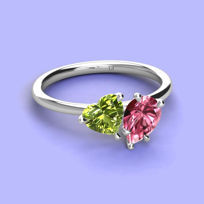 There's something so romantic, and oh-so-enchanting about this duo two stone engagement ring. This spectacular design features Heart shape Peridot and Pear Shape Pink Tourmaline that sets at slight angles towards each other.