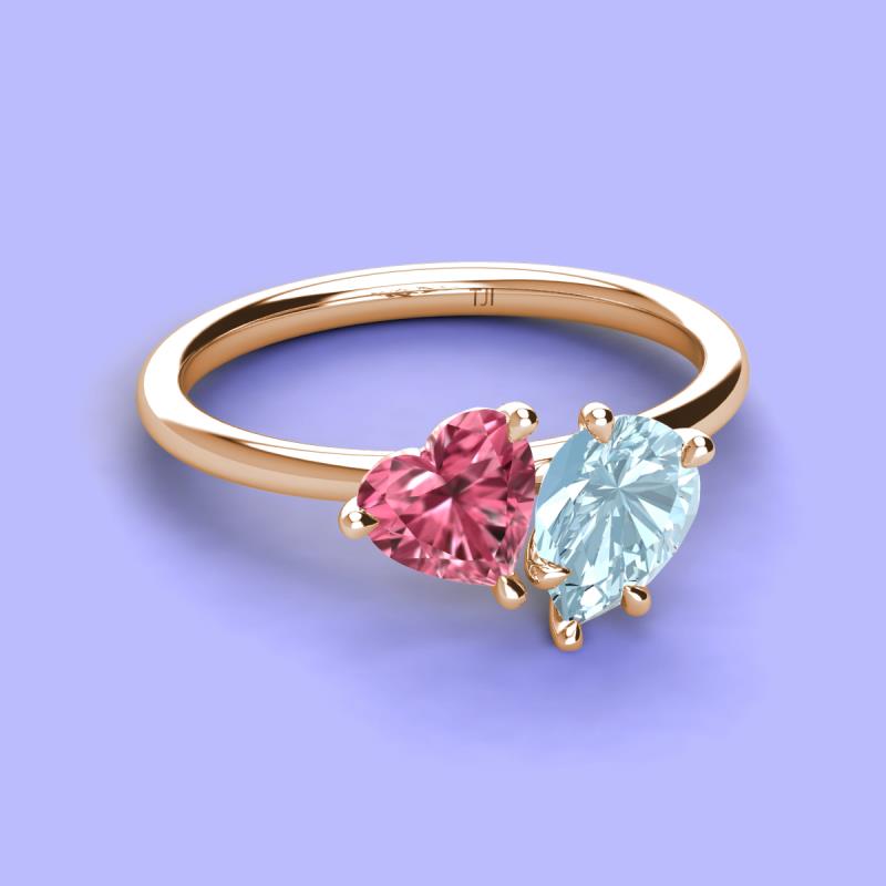 There's something so romantic, and oh-so-enchanting about this duo two stone engagement ring. This spectacular design features Heart shape Pink Tourmaline and Pear Shape Aquamarine that sets at slight angles towards each other.