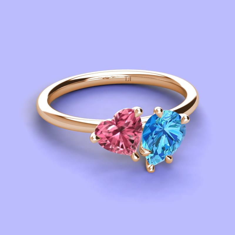 There's something so romantic, and oh-so-enchanting about this duo two stone engagement ring. This spectacular design features Heart shape Pink Tourmaline and Pear Shape Blue Topaz that sets at slight angles towards each other.