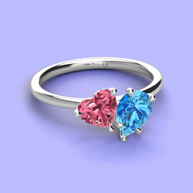 There's something so romantic, and oh-so-enchanting about this duo two stone engagement ring. This spectacular design features Heart shape Pink Tourmaline and Pear Shape Blue Topaz that sets at slight angles towards each other.