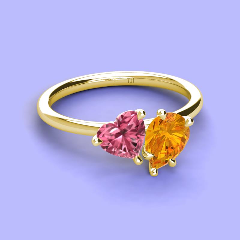 There's something so romantic, and oh-so-enchanting about this duo two stone engagement ring. This spectacular design features Heart shape Pink Tourmaline and Pear Shape Citrine that sets at slight angles towards each other.