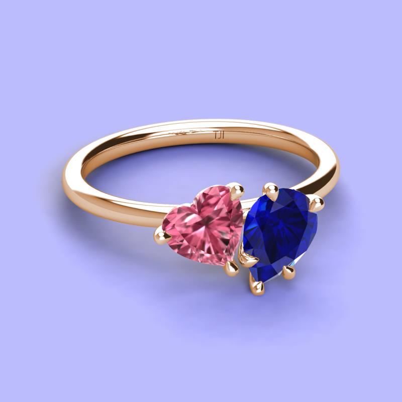 There's something so romantic, and oh-so-enchanting about this duo two stone engagement ring. This spectacular design features Heart shape Pink Tourmaline and Pear Shape Lab Created Blue Sapphire that sets at slight angles towards each other.
