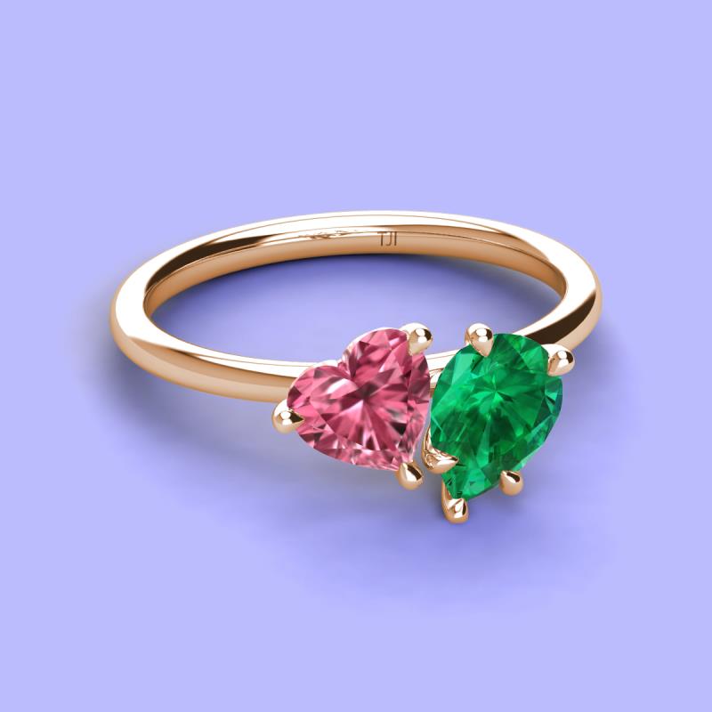 There's something so romantic, and oh-so-enchanting about this duo two stone engagement ring. This spectacular design features Heart shape Pink Tourmaline and Pear Shape Lab Created Emerald that sets at slight angles towards each other.