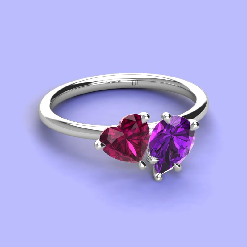 There's something so romantic, and oh-so-enchanting about this duo two stone engagement ring. This spectacular design features Heart shape Rhodolite Garnet and Pear Shape Amethyst that sets at slight angles towards each other.