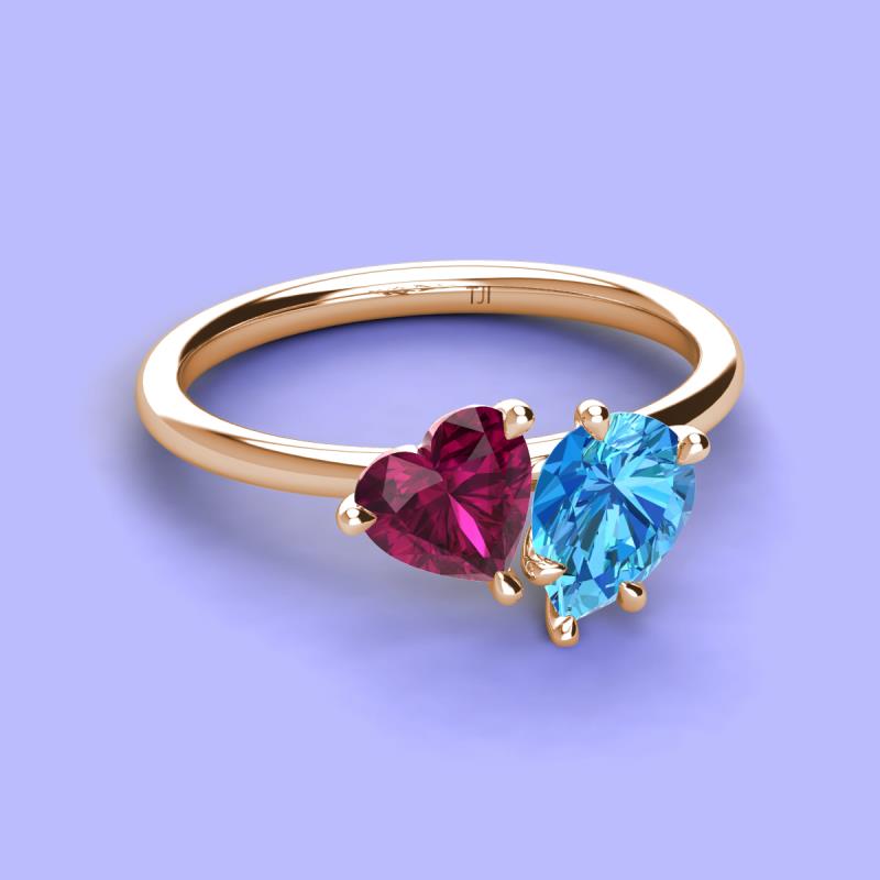 There's something so romantic, and oh-so-enchanting about this duo two stone engagement ring. This spectacular design features Heart shape Rhodolite Garnet and Pear Shape Blue Topaz that sets at slight angles towards each other.