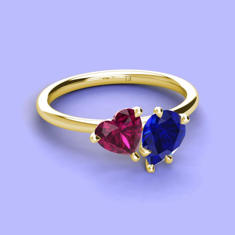 There's something so romantic, and oh-so-enchanting about this duo two stone engagement ring. This spectacular design features Heart shape Rhodolite Garnet and Pear Shape Lab Created Blue Sapphire that sets at slight angles towards each other.