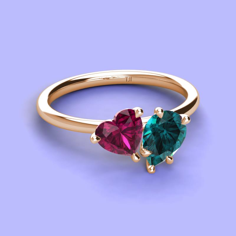 There's something so romantic, and oh-so-enchanting about this duo two stone engagement ring. This spectacular design features Heart shape Rhodolite Garnet and Pear Shape London Blue Topaz that sets at slight angles towards each other.