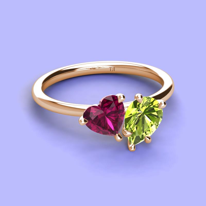 There's something so romantic, and oh-so-enchanting about this duo two stone engagement ring. This spectacular design features Heart shape Rhodolite Garnet and Pear Shape Peridot that sets at slight angles towards each other.