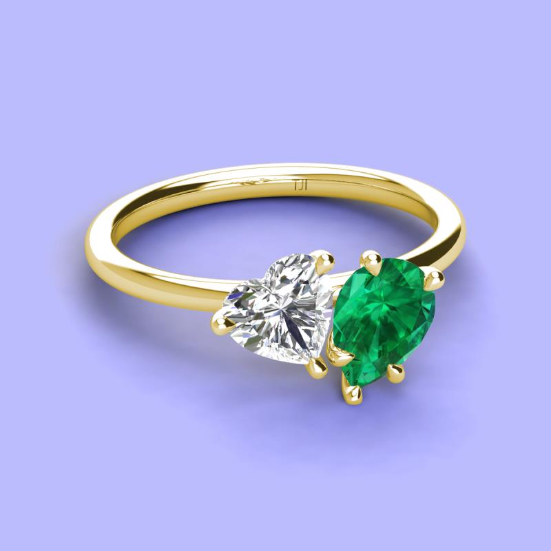 There's something so romantic, and oh-so-enchanting about this duo two stone engagement ring. This spectacular design features Heart Shape IGI Certified Lab Grown Diamond and Pear Shape Lab Created Emerald that sets at slight angles towards each other.