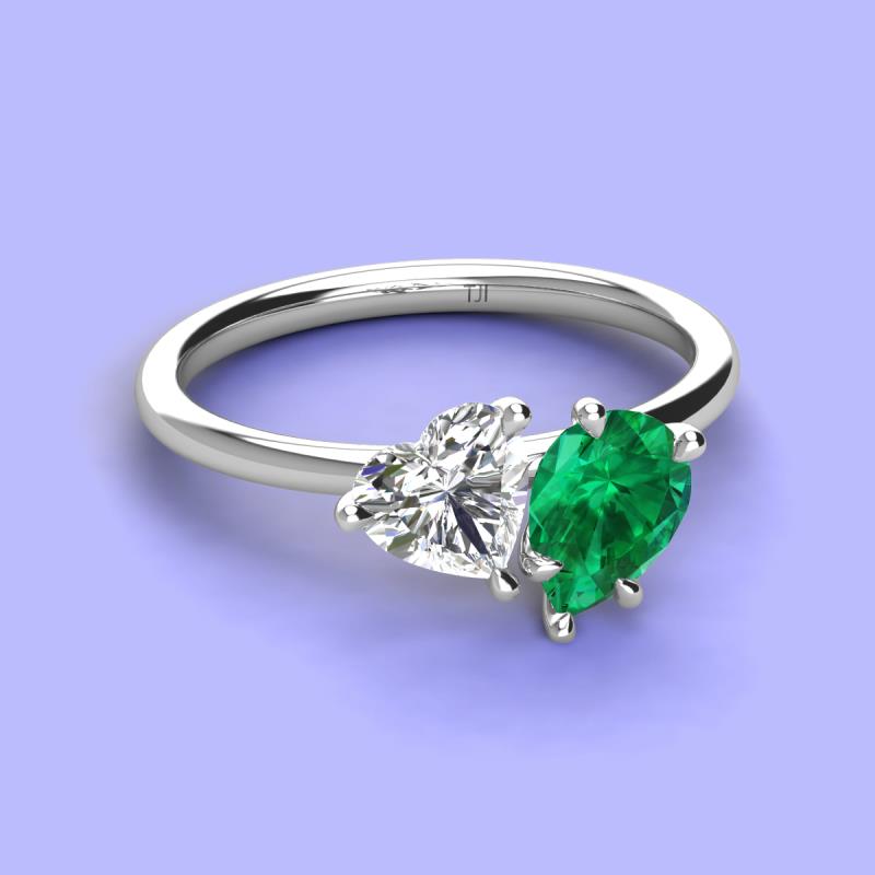 There's something so romantic, and oh-so-enchanting about this duo two stone engagement ring. This spectacular design features Heart Shape IGI Certified Lab Grown Diamond and Pear Shape Lab Created Emerald that sets at slight angles towards each other.
