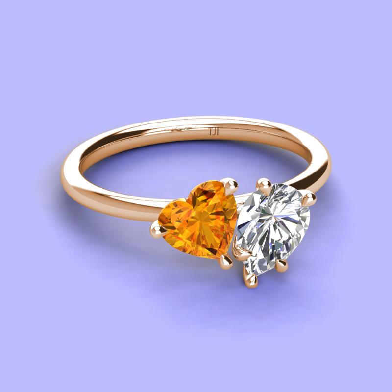 There's something so romantic, and oh-so-enchanting about this duo two stone engagement ring. This spectacular design features Heart shape Citrine and Pear Shape IGI Certified Lab Grown Diamond that sets at slight angles towards each other.