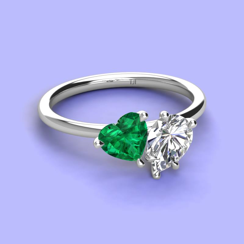 There's something so romantic, and oh-so-enchanting about this duo two stone engagement ring. This spectacular design features Heart Shape Lab Created Emerald and Pear Shape IGI Certified Lab Grown Diamond that sets at slight angles towards each other.
