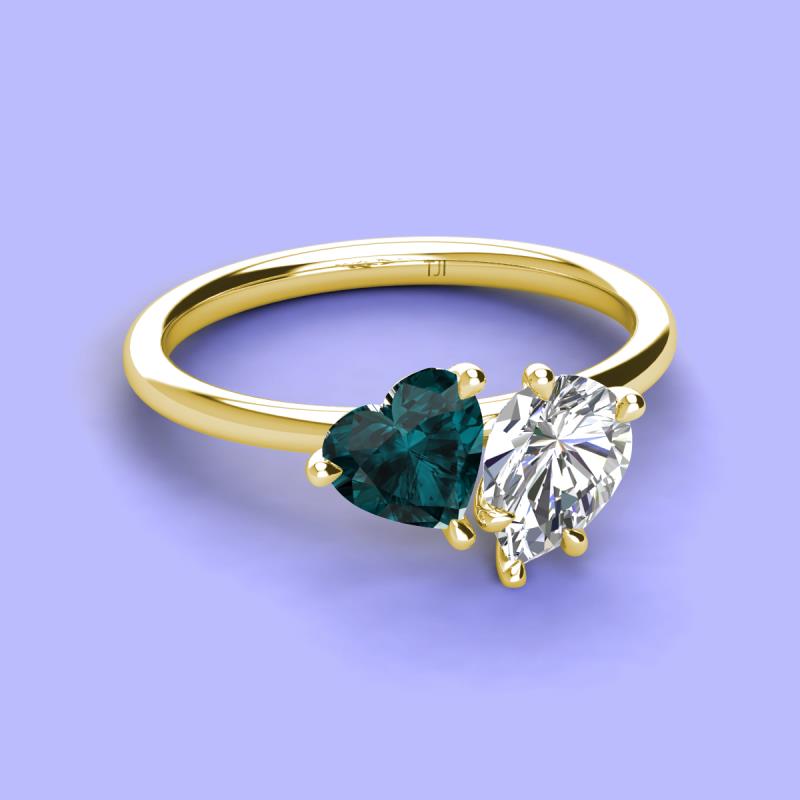 There's something so romantic, and oh-so-enchanting about this duo two stone engagement ring. This spectacular design features Heart shape London Blue Topaz and Pear Shape IGI Certified Lab Grown Diamond that sets at slight angles towards each other.