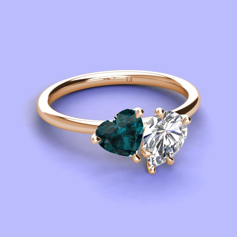 There's something so romantic, and oh-so-enchanting about this duo two stone engagement ring. This spectacular design features Heart shape London Blue Topaz and Pear Shape IGI Certified Lab Grown Diamond that sets at slight angles towards each other.