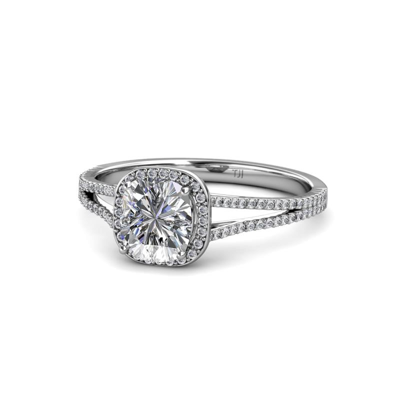 This Glorious 0.25 ct tw Semi Mount Engagement Ring reflects elegance and beauty beyond comparison with a Halo Cushion Frame of shimmering Round Diamonds with additional Diamonds two tapered on either sides which suits her impeccable style.