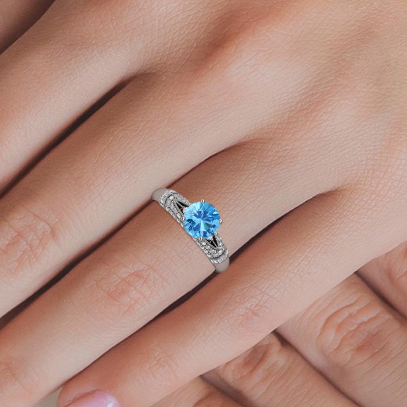 A mesmerizing round Blue Topaz shines at the heart of this vintage-inspired masterpiece, framed by 56 lab grown diamonds, delicate milgrain accents, and a graceful split shank.